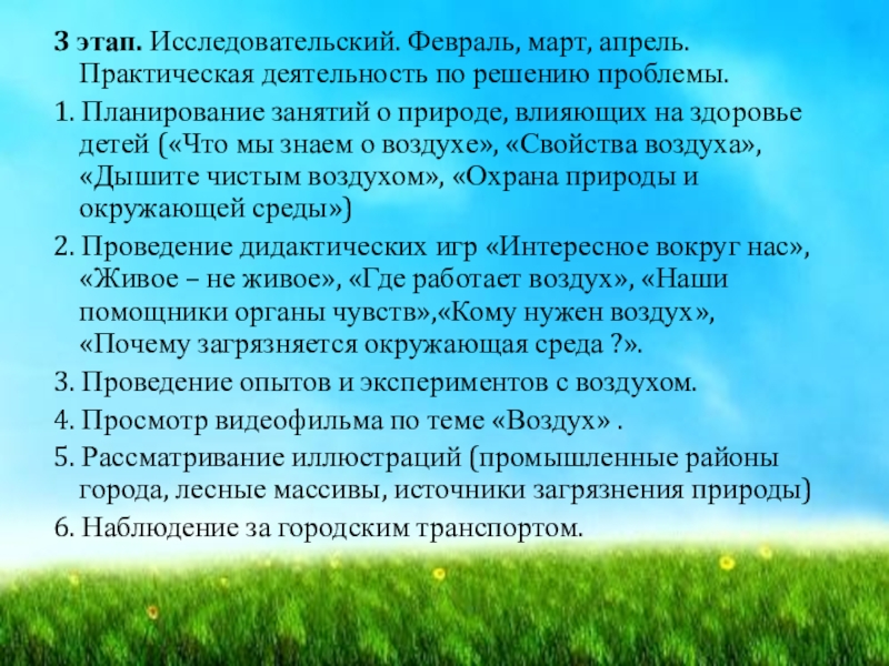 Слайд 73 этап. Исследовательский. Февраль, март, апрель. Практическая деятельность по решению проблемы.