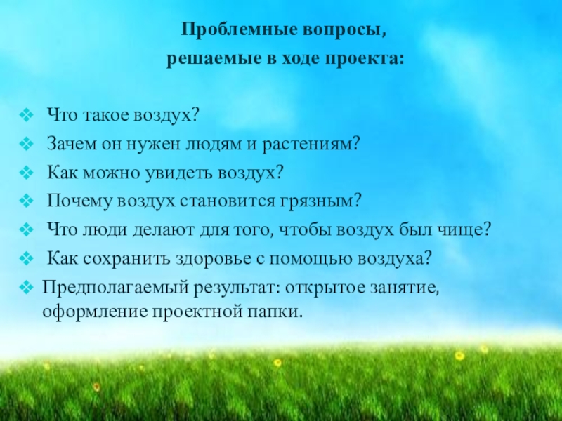 -дать детям элементарные представления об источниках загрязнения воздуха о значении чистого воздуха для всего живого и для здоровья человека в частности;