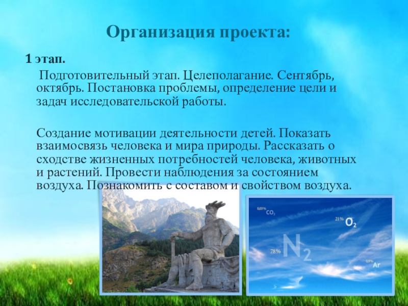 Создание мотивации деятельности детей. Показать взаимосвязь человека и мира природы. Рассказать о сходстве жизненных потребностей человека, животных и растений. Провести наблюдения за состоянием воздуха. Познакомить с составом и свойством воздуха.