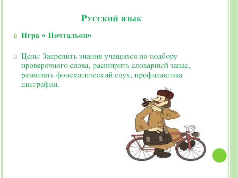 Русский язык Игра « Почтальон»  Цель: Закрепить знания учащихся по подбору проверочного слова, расширить словарный запас,