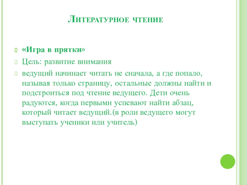 Литературное чтение «Игра в прятки» Цель: развитие вниманияведущий начинает читать не сначала, а где попало, называя только страницу,