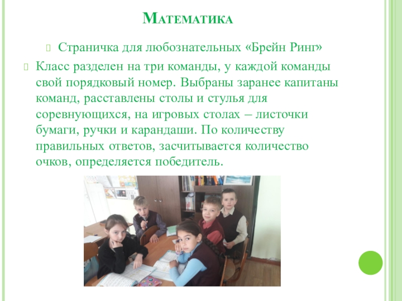 Математика Страничка для любознательных «Брейн Ринг» Класс разделен на три команды, у каждой команды свой порядковый номер.