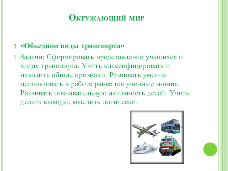 Окружающий мир «Объедини виды транспорта»Задачи: Сформировать представление учащихся о видах транспорта. Учить классифицировать и находить общие признаки.