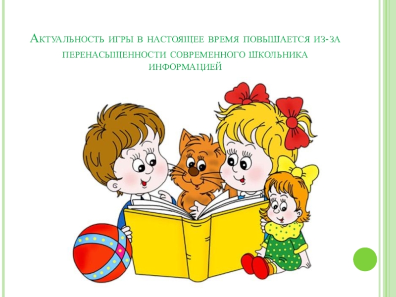 Слайд 3 Актуальность игры в настоящее время повышается из-за перенасыщенности современного школьника информацией
