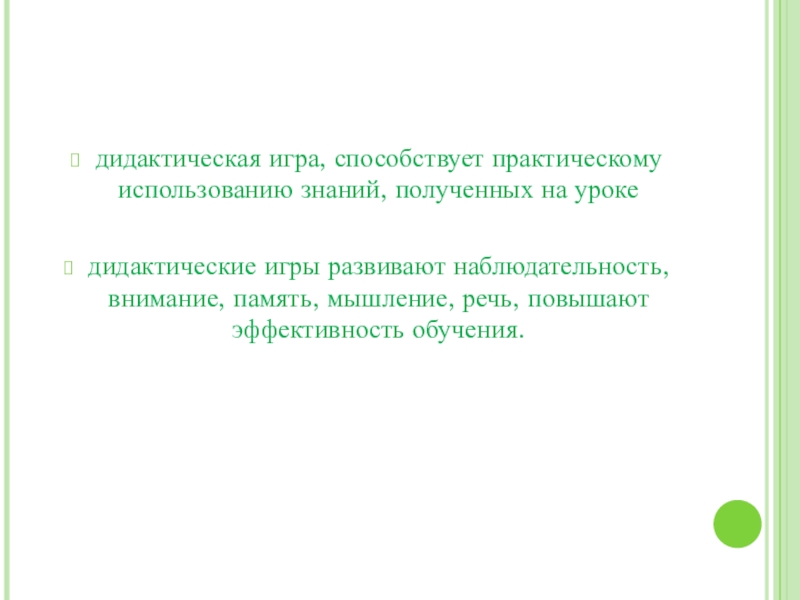 дидактическая игра, способствует практическому использованию знаний, полученных на урокедидактические игры развивают наблюдательность, внимание, память, мышление, речь,