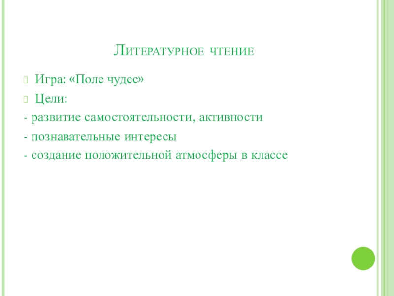 Литературное чтениеИгра: «Поле чудес»Цели:- развитие самостоятельности, активности- познавательные интересы- создание положительной атмосферы в классе