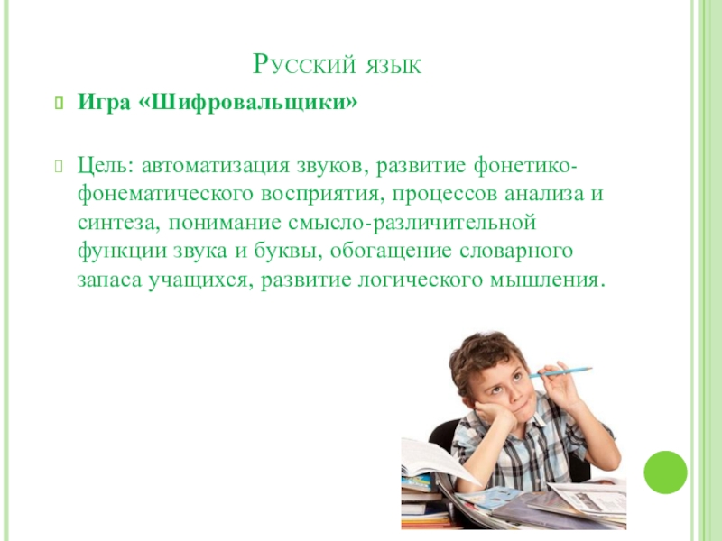 Русский языкИгра «Шифровальщики»  Цель: автоматизация звуков, развитие фонетико-фонематического восприятия, процессов анализа и синтеза, понимание смысло-различительной функции