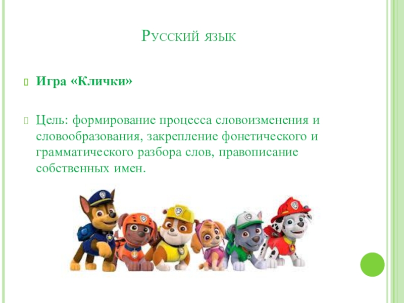 Русский языкИгра «Клички» Цель: формирование процесса словоизменения и словообразования, закрепление фонетического и грамматического разбора слов, правописание собственных