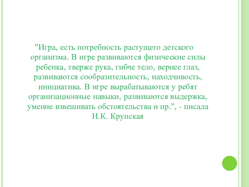 ребенка, тверже рука, гибче тело, вернее глаз, развиваются сообразительность, находчивость, инициатива. В игре вырабатываются у ребят организационные навыки, развиваются выдержка, умение взвешивать обстоятельства и пр.", - писала Н.К. Крупская
