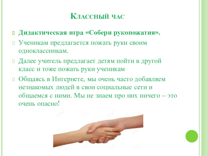 Классный час Дидактическая игра «Собери рукопожатия».Ученикам предлагается пожать руки своим одноклассникам.Далее учитель предлагает детям пойти в другой