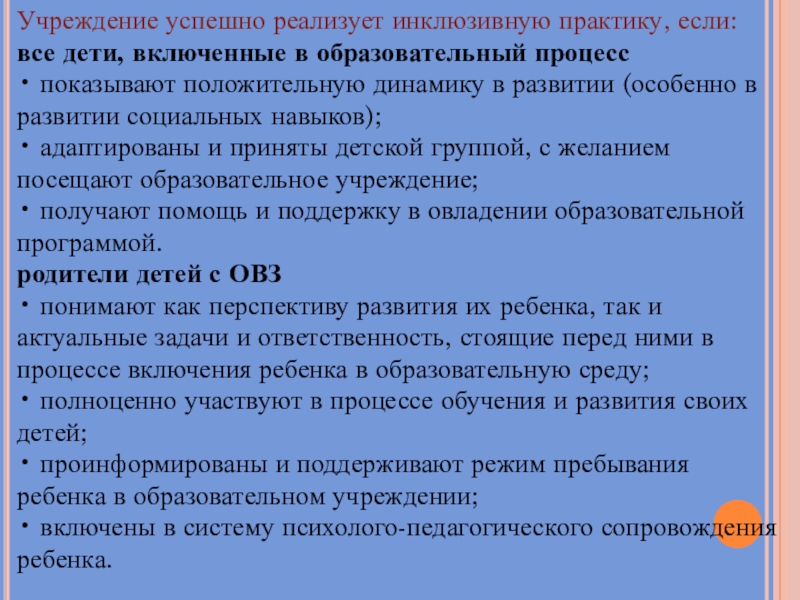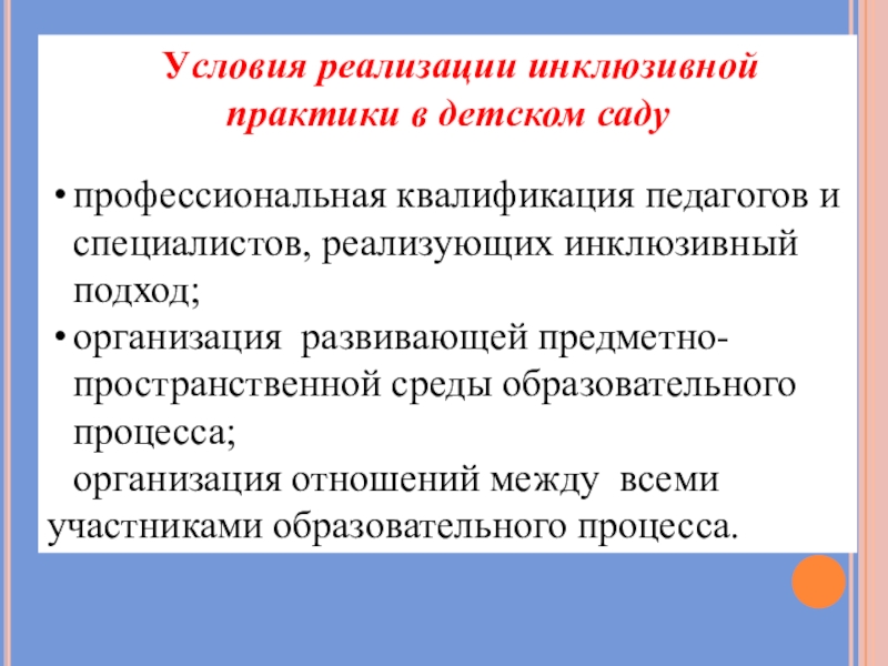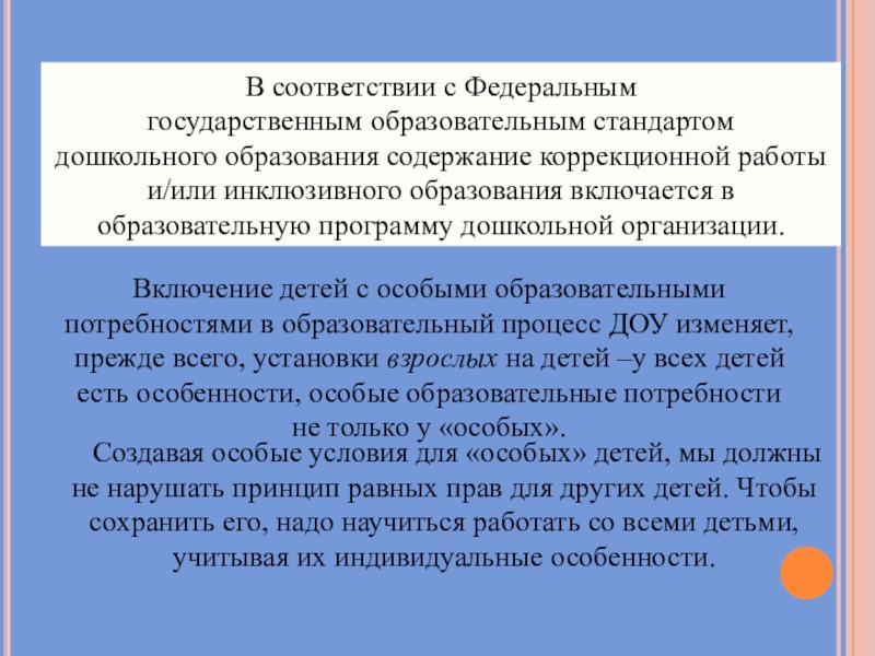 Создавая особые условия для «особых» детей, мы должны не нарушать принцип равных прав для других детей. Чтобы сохранить его, надо научиться работать со всеми детьми, учитывая их индивидуальные особенности.