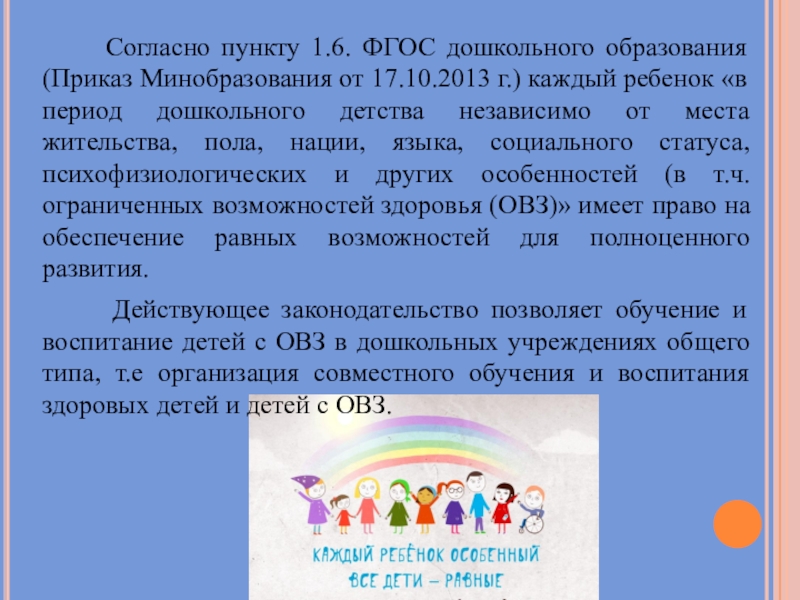Действующее законодательство позволяет обучение и воспитание детей с ОВЗ в дошкольных учреждениях общего типа, т.е организация совместного обучения и воспитания здоровых детей и детей с ОВЗ.