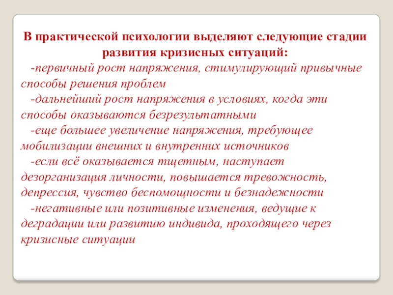 Слайд 27В практической психологии выделяют следующие стадии развития кризисных ситуаций: