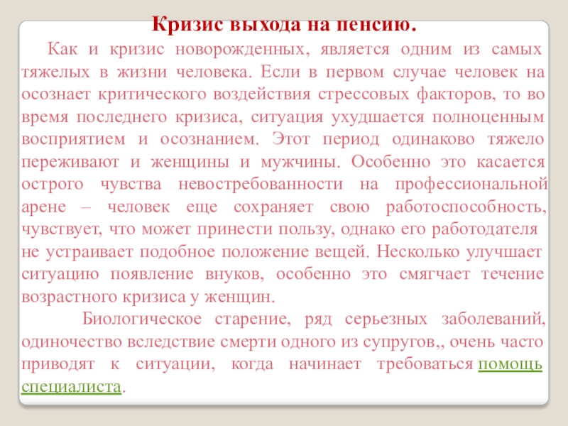 самых тяжелых в жизни человека. Если в первом случае человек на осознает критического воздействия стрессовых факторов, то во время последнего кризиса, ситуация ухудшается полноценным восприятием и осознанием. Этот период одинаково тяжело переживают и женщины и мужчины. Особенно это касается острого чувства невостребованности на профессиональной арене – человек еще сохраняет свою работоспособность, чувствует, что может принести пользу, однако его работодателя не устраивает подобное положение вещей. Несколько улучшает ситуацию появление внуков, особенно это смягчает течение возрастного кризиса у женщин.