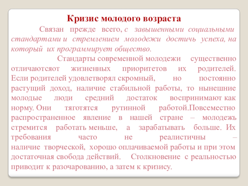 Стандарты современной молодежи существенно отличаютсяот жизненных приоритетов их родителей. Если родителей удовлетворял скромный, но постоянно растущий доход, наличие стабильной работы, то нынешние молодые люди средний достаток воспринимают как норму. Они тяготятся рутинной работой.Повсеместно распространенное явление в нашей стране – молодежь стремится работать меньше, а зарабатывать больше. Их требования часто не реалистичны – наличие творческой, хорошо оплачиваемой работы и при этом достаточная свобода действий. Столкновение с реальностью приводит к разочарованию, а затем к кризису.