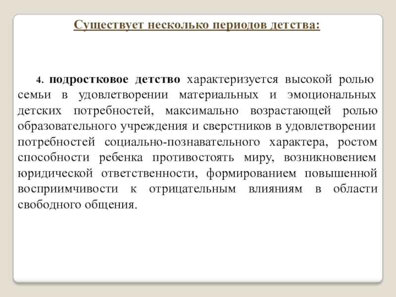 ролью семьи в удовлетворении материальных и эмоциональных детских потребностей, максимально возрастающей ролью образовательного учреждения и сверстников в удовлетворении потребностей социально-познавательного характера, ростом способности ребенка противостоять миру, возникновением юридической ответственности, формированием повышенной восприимчивости к отрицательным влияниям в области свободного общения.