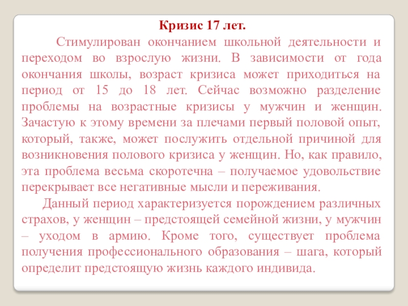 во взрослую жизни. В зависимости от года окончания школы, возраст кризиса может приходиться на период от 15 до 18 лет. Сейчас возможно разделение проблемы на возрастные кризисы у мужчин и женщин. Зачастую к этому времени за плечами первый половой опыт, который, также, может послужить отдельной причиной для возникновения полового кризиса у женщин. Но, как правило, эта проблема весьма скоротечна – получаемое удовольствие перекрывает все негативные мысли и переживания.