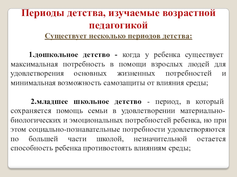 1.дошкольное детство - когда у ребенка существует максимальная потребность в помощи взрослых людей для удовлетворения основных жизненных потребностей и минимальная возможность самозащиты от влияния среды;