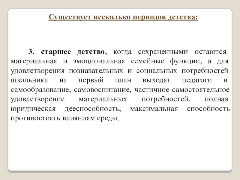 2.младшее школьное детство - период, в который сохраняется помощь семьи в удовлетворении материально-биологических и эмоциональных потребностей ребенка, но при этом социально-познавательные потребности удовлетворяются по большей части школой, незначительной остается способность ребенка противостоять влияниям среды;