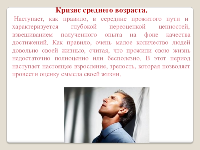 Наступает, как правило, в середине прожитого пути и характеризуется