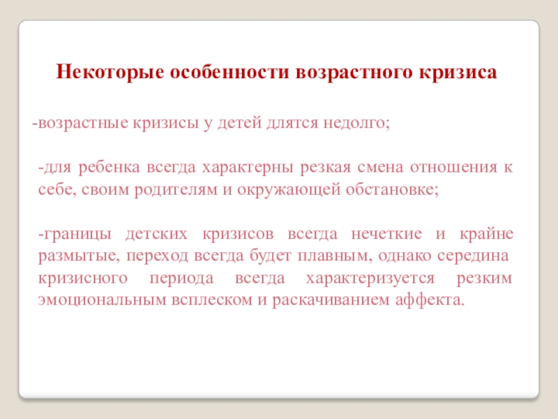 -границы детских кризисов всегда нечеткие и крайне размытые, переход всегда будет плавным, однако середина кризисного периода всегда характеризуется резким эмоциональным всплеском и раскачиванием аффекта.