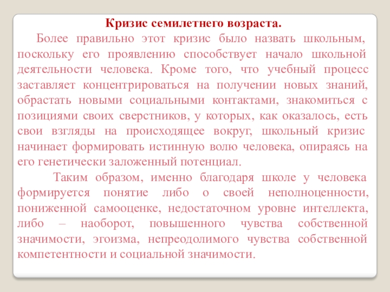 его проявлению способствует начало школьной деятельности человека. Кроме того, что учебный процесс заставляет концентрироваться на получении новых знаний, обрастать новыми социальными контактами, знакомиться с позициями своих сверстников, у которых, как оказалось, есть свои взгляды на происходящее вокруг, школьный кризис начинает формировать истинную волю человека, опираясь на его генетически заложенный потенциал.