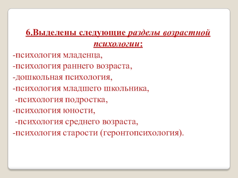 Слайд 136.Выделены следующие разделы возрастной психологии:
