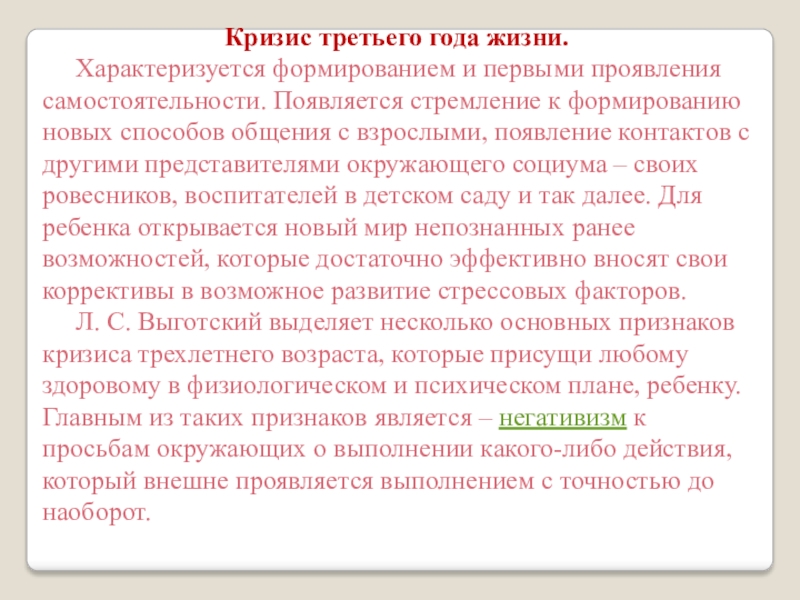 Л. С. Выготский выделяет несколько основных признаков кризиса трехлетнего возраста, которые присущи любому здоровому в физиологическом и психическом плане, ребенку. Главным из таких признаков является – негативизм к просьбам окружающих о выполнении какого-либо действия, который внешне проявляется выполнением с точностью до наоборот.