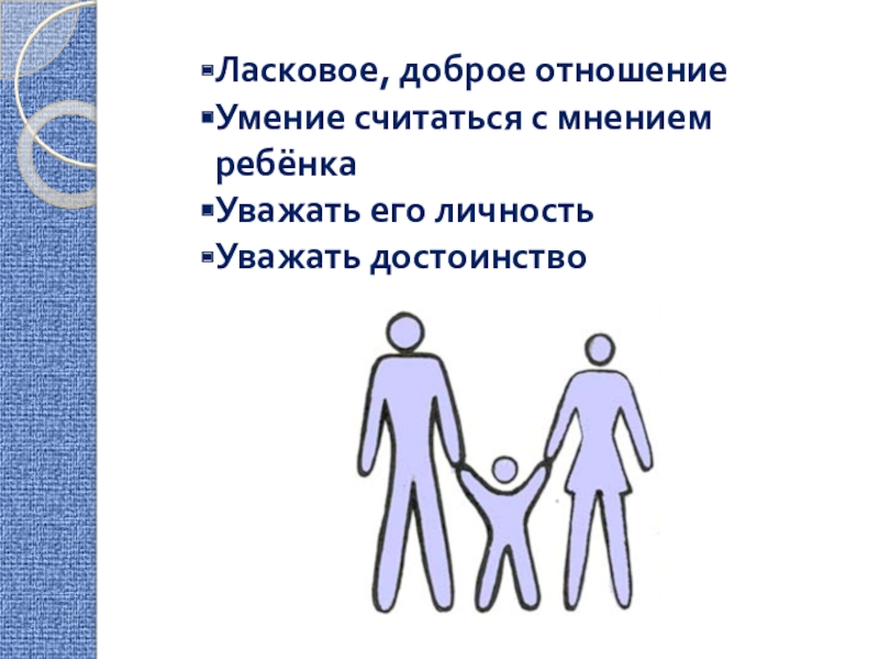 Ласковое, доброе отношениеУмение считаться с мнением ребёнкаУважать его личностьУважать достоинство