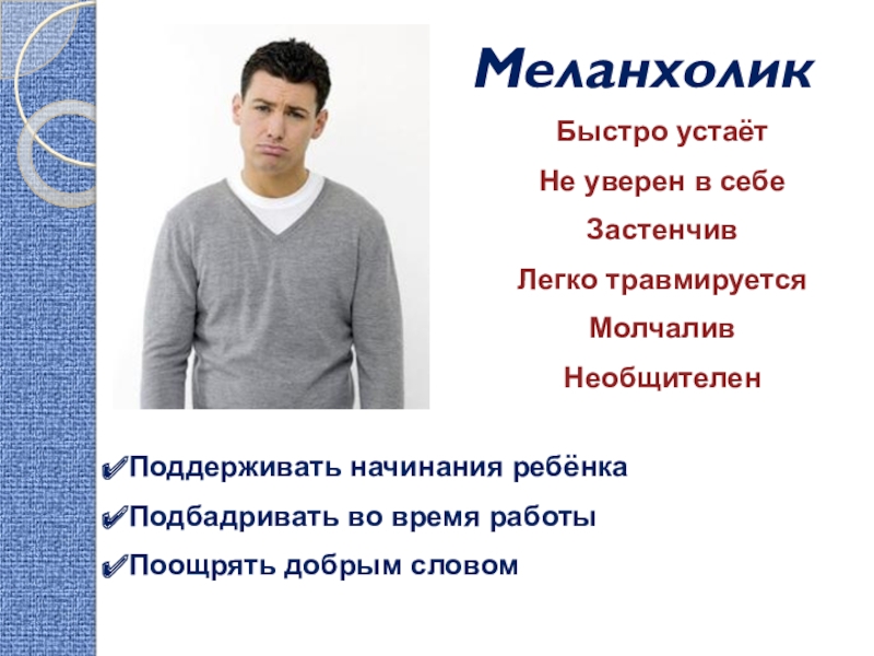 МеланхоликБыстро устаётНе уверен в себеЗастенчивЛегко травмируетсяМолчаливНеобщителенПоддерживать начинания ребёнкаПодбадривать во время работыПоощрять добрым словом