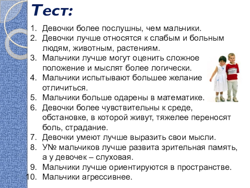 Тест:Девочки более послушны, чем мальчики.Девочки лучше относятся к слабым и больным людям, животным, растениям.Мальчики лучше могут оценить