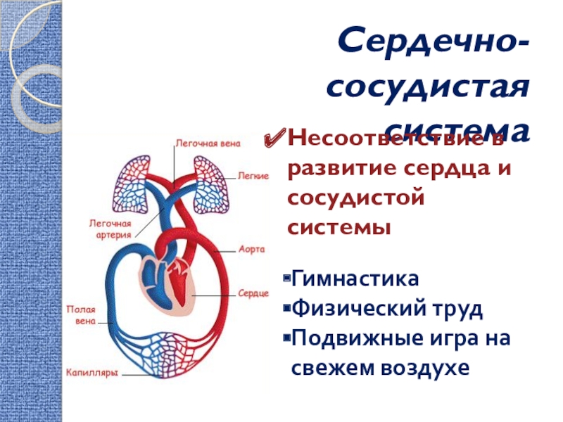 Сердечно-сосудистая системаГимнастикаФизический трудПодвижные игра на свежем воздухеНесоответствие в развитие сердца и сосудистой системы