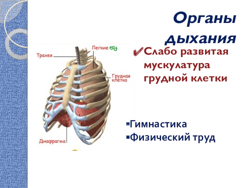 Органы дыханияГимнастикаФизический трудСлабо развитая мускулатура грудной клетки