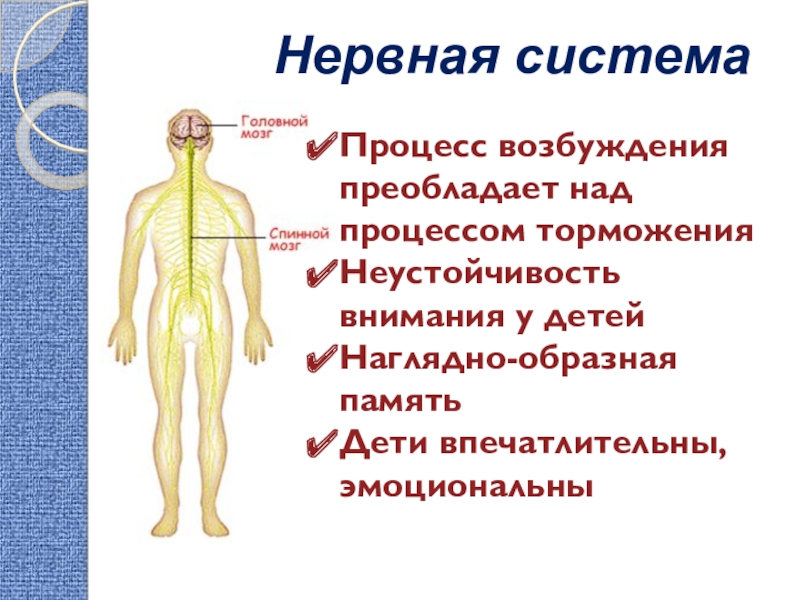 Нервная системаПроцесс возбуждения преобладает над процессом торможенияНеустойчивость внимания у детейНаглядно-образная памятьДети впечатлительны, эмоциональны