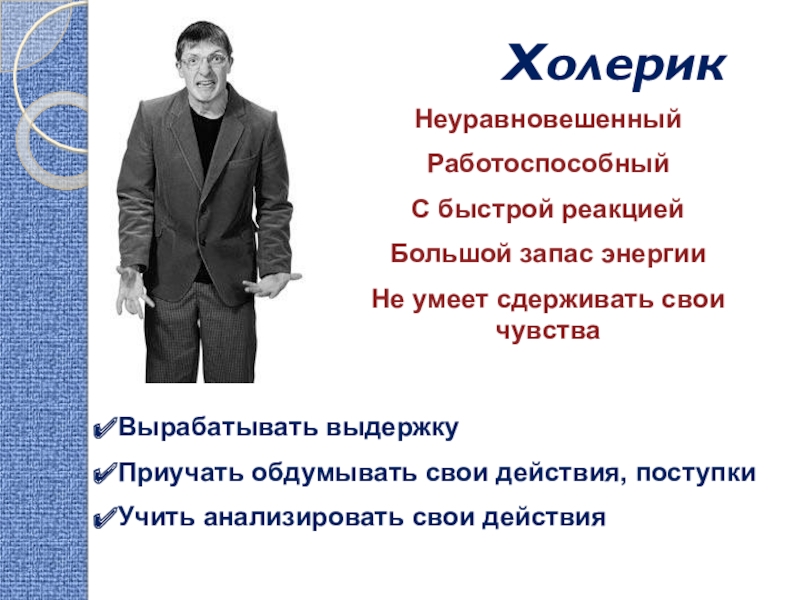 ХолерикНеуравновешенныйРаботоспособныйС быстрой реакциейБольшой запас энергииНе умеет сдерживать свои чувстваВырабатывать выдержкуПриучать обдумывать свои действия, поступкиУчить анализировать свои действия