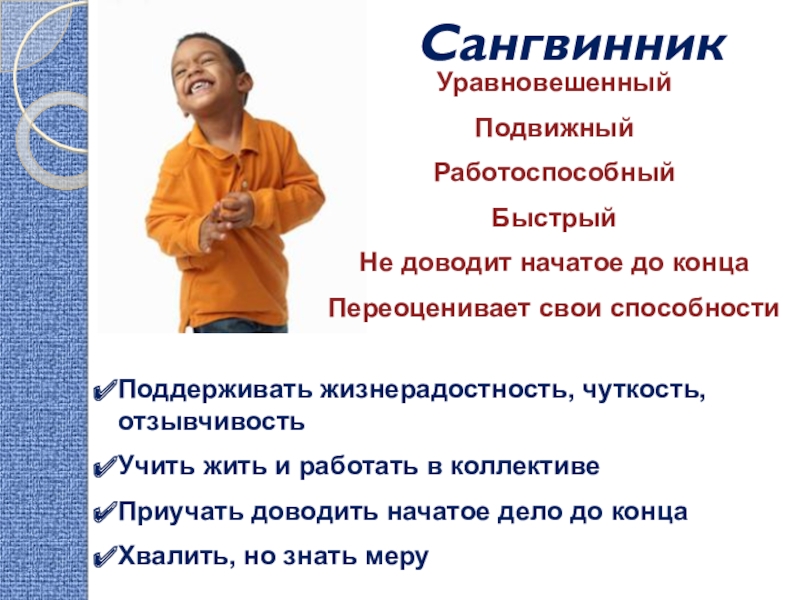СангвинникУравновешенныйПодвижныйРаботоспособныйБыстрыйНе доводит начатое до концаПереоценивает свои способностиПоддерживать жизнерадостность, чуткость, отзывчивостьУчить жить и работать в коллективеПриучать доводить начатое