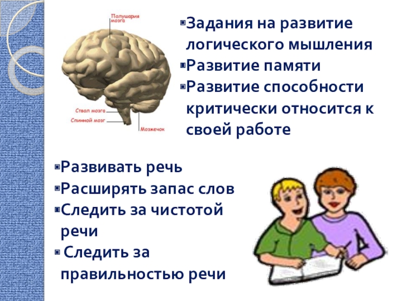 Развивать речьРасширять запас словСледить за чистотой речи Следить за правильностью речиЗадания на развитие логического мышленияРазвитие памятиРазвитие способности
