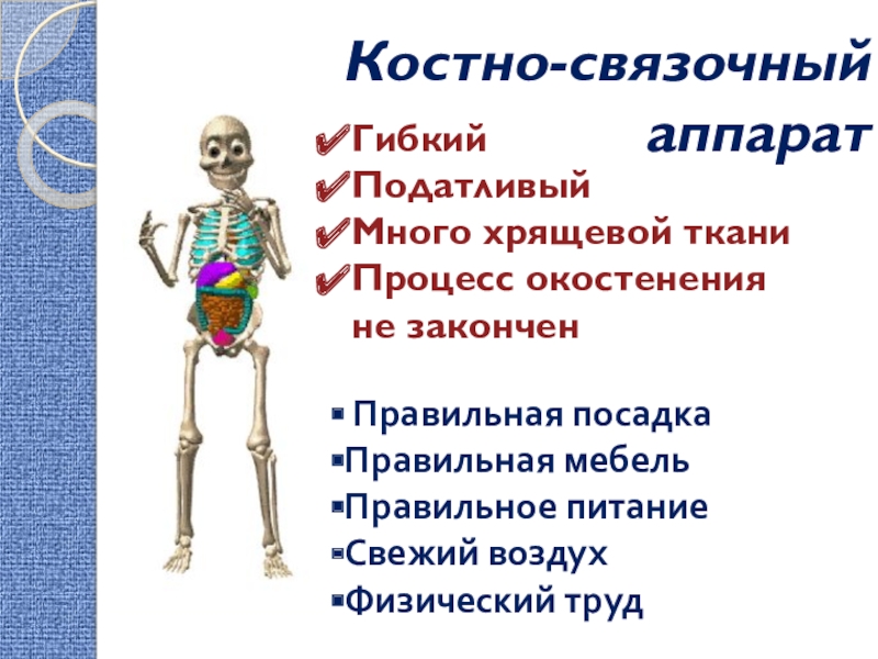 Костно-связочный аппаратГибкийПодатливыйМного хрящевой тканиПроцесс окостенения не закончен Правильная посадкаПравильная мебельПравильное питаниеСвежий воздухФизический труд