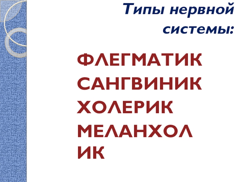 Типы нервной системы:ФЛЕГМАТИКСАНГВИНИКХОЛЕРИКМЕЛАНХОЛИК