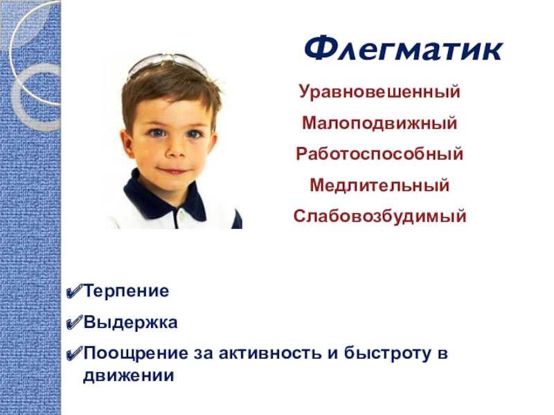 ФлегматикУравновешенныйМалоподвижныйРаботоспособныйМедлительный СлабовозбудимыйТерпениеВыдержкаПоощрение за активность и быстроту в движении