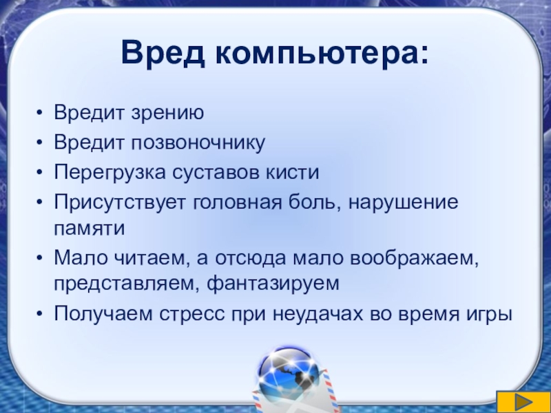 Это сайт презентаций, где можно хранить и обмениваться своими презентациями, докладами, проектами, шаблонами в формате PowerPoint с другими пользователями. Мы помогаем школьникам, студентам, учителям, преподавателям хранить и обмениваться учебными материалами.