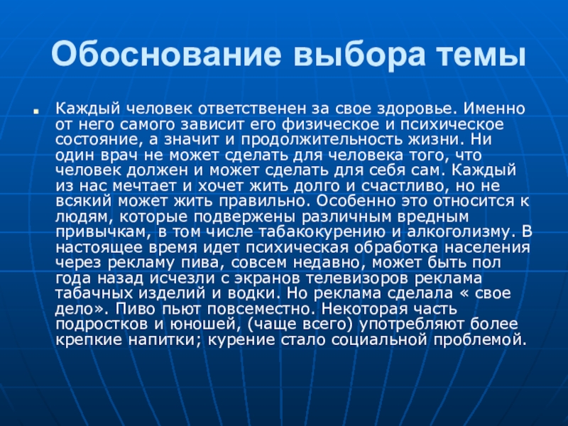 него самого зависит его физическое и психическое состояние, а значит и продолжительность жизни. Ни один врач не может сделать для человека того, что человек должен и может сделать для себя сам. Каждый из нас мечтает и хочет жить долго и счастливо, но не всякий может жить правильно. Особенно это относится к людям, которые подвержены различным вредным привычкам, в том числе табакокурению и алкоголизму. В настоящее время идет психическая обработка населения через рекламу пива, совсем недавно, может быть пол года назад исчезли с экранов телевизоров реклама табачных изделий и водки. Но реклама сделала « свое дело». Пиво пьют повсеместно. Некоторая часть подростков и юношей, (чаще всего) употребляют более крепкие напитки; курение стало социальной проблемой.