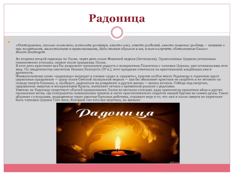 В этот день христиане как бы разделяют пасхальную радость о воскресении Спасителя с членами Церкви, уже оставившими этот мир. По свидетельству святителя Иоанна Златоуста (IV в.), этот праздник отмечался на христианских кладбищах уже в древности.