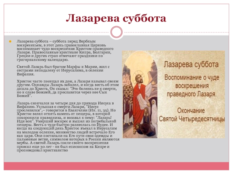 Лазарь скончался за четыре дня до прихода Иисуса в Вифанию. Услышав о смерти Лазаря, "Иисус прослезился",– говорится в Евангелии (Ин. 11, 35). Но Христос велел отнять камень от пещеры, в которой похоронили праведника, и воззвал к нему: "Лазарь! Иди вон". Умерший воскрес и вышел из погребальной пещеры. Весть о чуде быстро разнеслась по Иудее. И когда на следующий день Христос въехал в Иерусалим на молодом осленке, множество людей встречало Его как царя. Они постилали на Его пути свои одежды и пальмовые ветви, символом которых в России являются вербы. А святой Лазарь после своего воскрешения прожил еще 30 лет - он был епископом на Кипре и проповедовал христианство