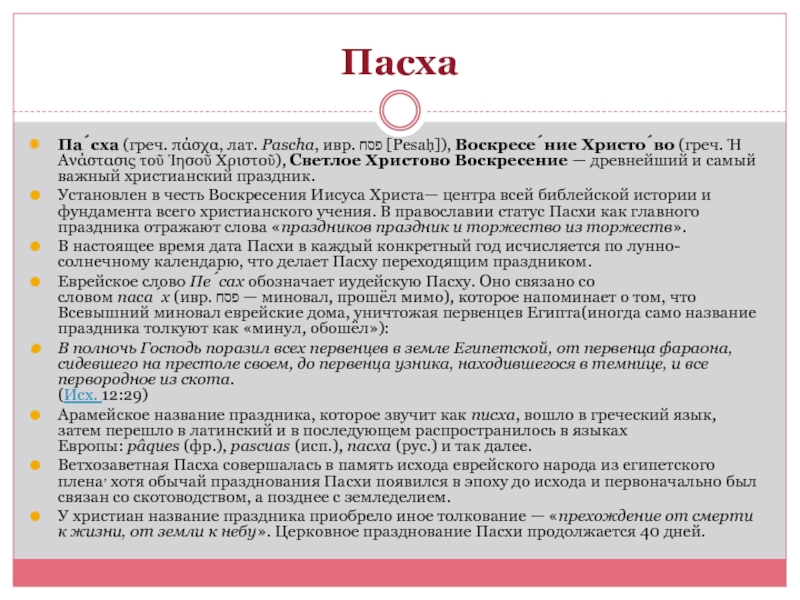 Па́сха (греч. πάσχα, лат. Pascha, ивр. פסח [Pesaḥ]), Воскресе́ние Христо́во (греч. Ἡ Ανάστασις τοῦ Ἰησοῦ Χριστοῦ), Светлое Христово Воскресение — древнейший и самый