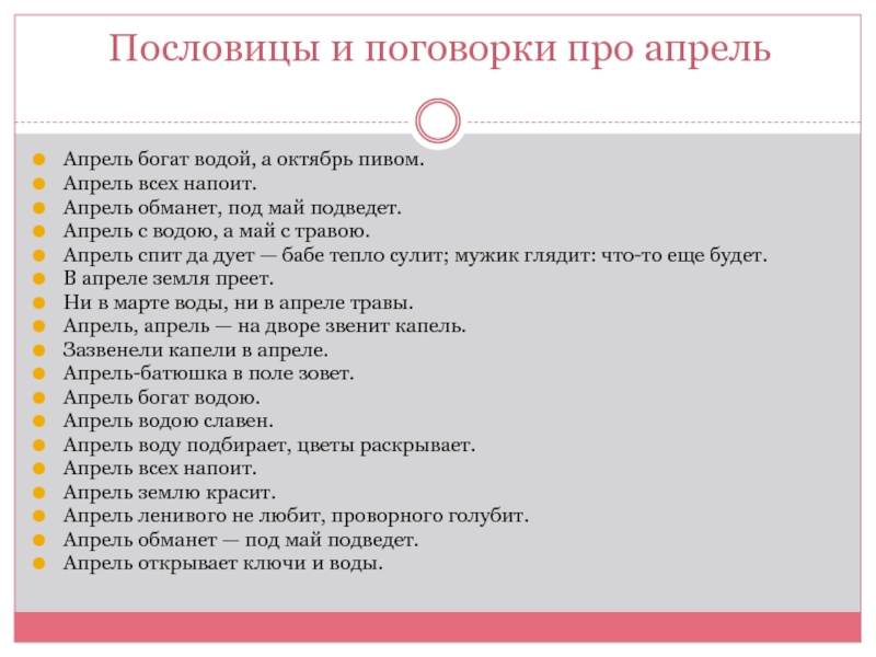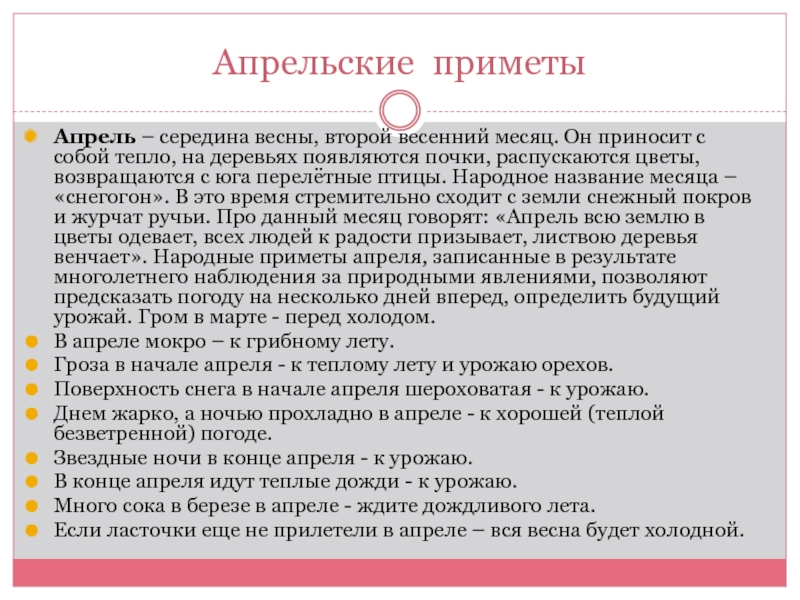тепло, на деревьях появляются почки, распускаются цветы, возвращаются с юга перелётные птицы. Народное название месяца – «снегогон». В это время стремительно сходит с земли снежный покров и журчат ручьи. Про данный месяц говорят: «Апрель всю землю в цветы одевает, всех людей к радости призывает, листвою деревья венчает». Народные приметы апреля, записанные в результате многолетнего наблюдения за природными явлениями, позволяют предсказать погоду на несколько дней вперед, определить будущий урожай. Гром в марте - перед холодом.