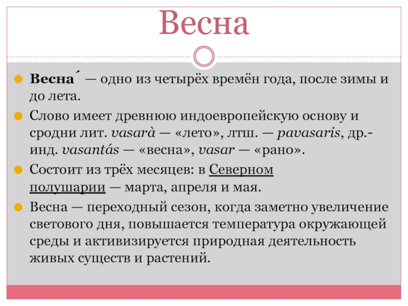 и сродни лит. vasarà — «лето», лтш. — pavasaris, др.-инд. vasantás — «весна», vasar — «рано».