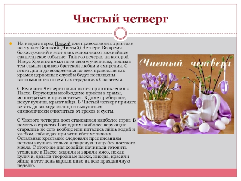 С Великого Четверга начинаются приготовления к Пасхе. Верующим необходимо прийти в храмы, исповедаться и причаститься. В доме прибирают, пекут куличи, красят яйца. В Чистый четверг принято встать до восхода солнца и выкупаться - символически очиститься от грехов и суеты.