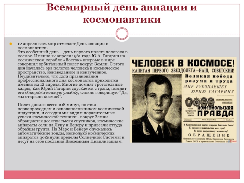 Это особенный день – день первого полета человека в космос. Именно 12 апреля 1961 года Ю.А. Гагарин на космическом корабле «Восток» впервые в мире совершил орбитальный полет вокруг Земли. С этого дня началась эра полетов человека в космическое пространство, неизведанное и неизученное.