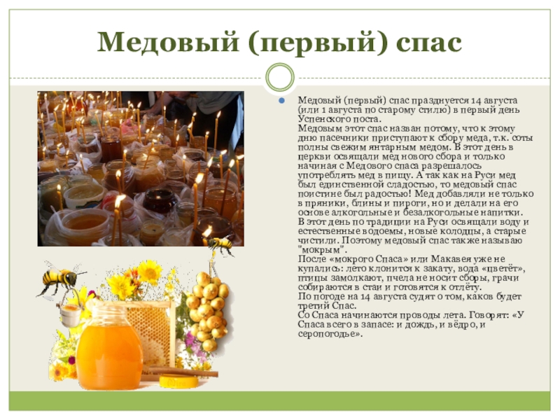 Медовым этот спас назван потому, что к этому дню пасечники приступают к сбору меда, т.к. соты полны свежим янтарным медом. В этот день в церкви освящали мед нового сбора и только начиная с Медового спаса разрешалось употреблять мед в пищу. А так как на Руси мед был единственной сладостью, то медовый спас поистине был радостью! Мед добавляли не только в пряники, блины и пироги, но и делали на его основе алкогольные и безалкогольные напитки.